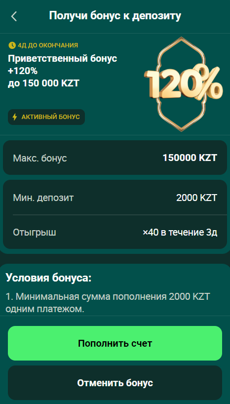 Игроки из Казахстана могут получить бонус до 150 000 KZT при пополнении счета от 2 000 KZT. Бонус можно отыграть в течение 3 дней с коэффициентом ×40, играя в слоты. Важно помнить, что максимальный выигрыш от бонуса — это 10 раз его сумма, а также что бонус доступен только для одного игрового счета на человека, семью или IP-адрес.